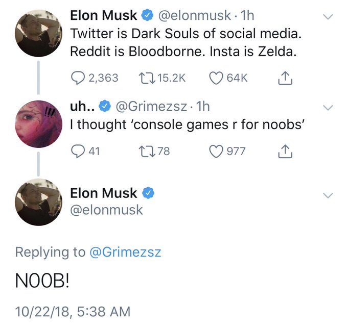 Elon Musk On Twitter Twitter Is Dark Souls Of Social Media Reddit Is Bloodborne Insta Is Zelda